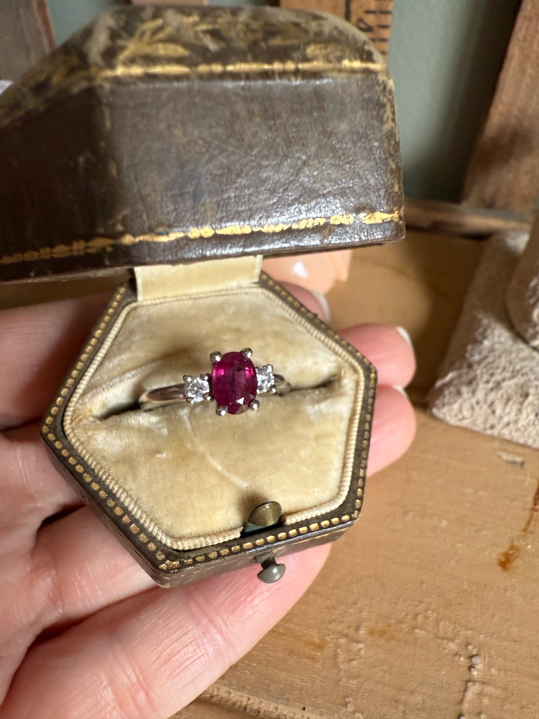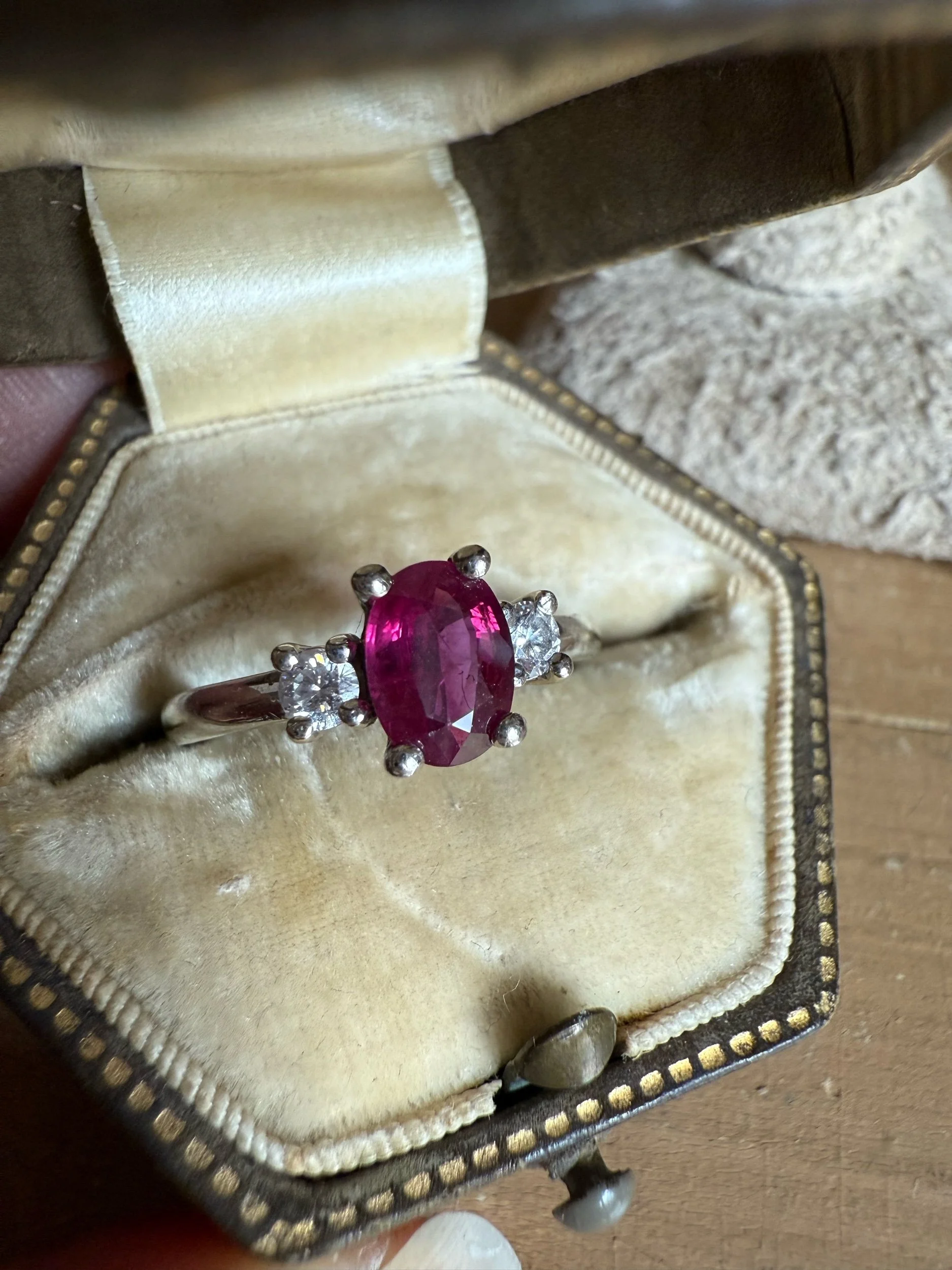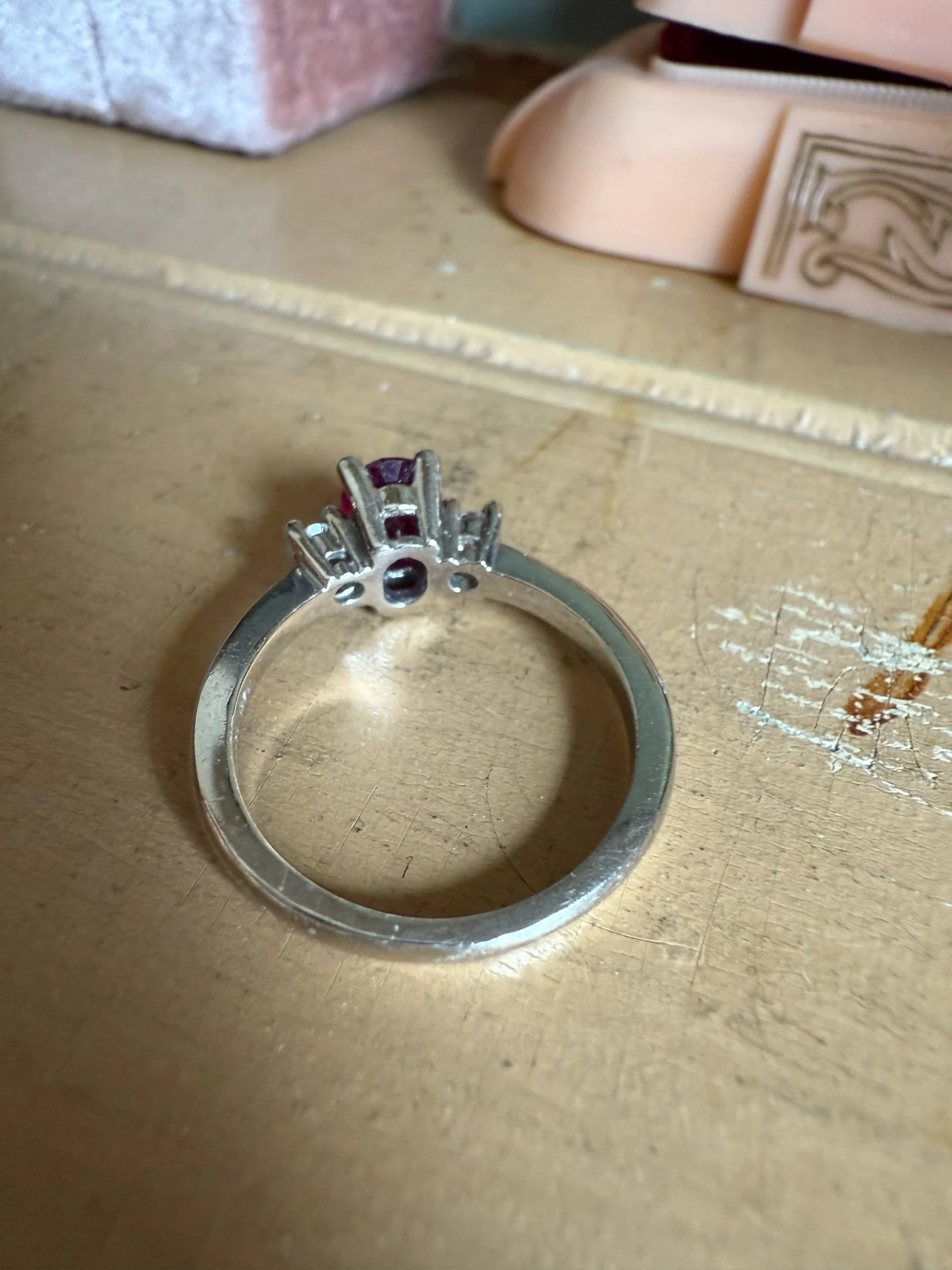 14k white gold (stamped in shank and tested) ring features an oval synthetic ruby measuring approx. 7 x 5 mm set by four prongs. On each side are round cut natural diamonds measuring approx. 3 mm each. Soldily made ring-not a flimsy mounting.