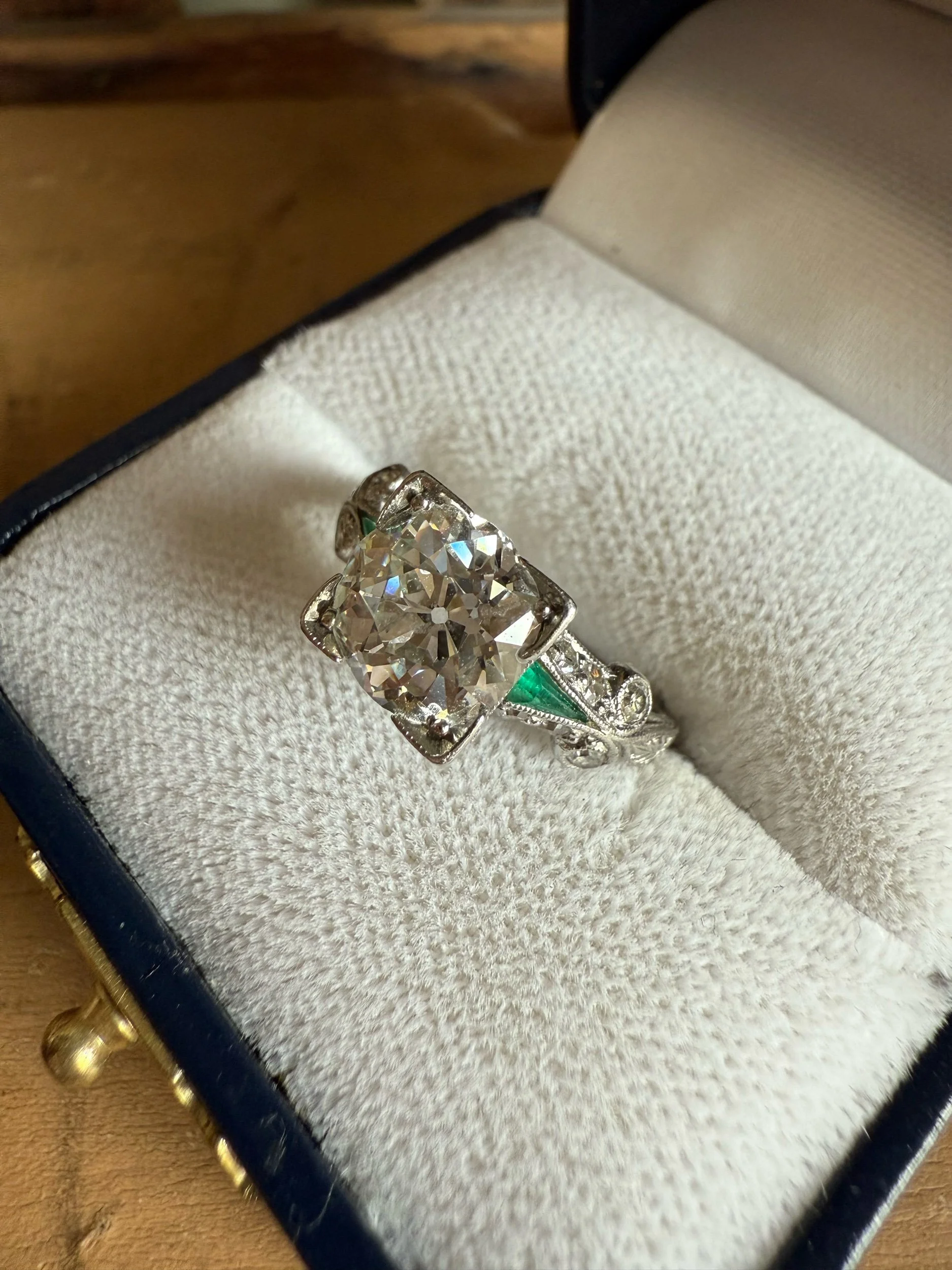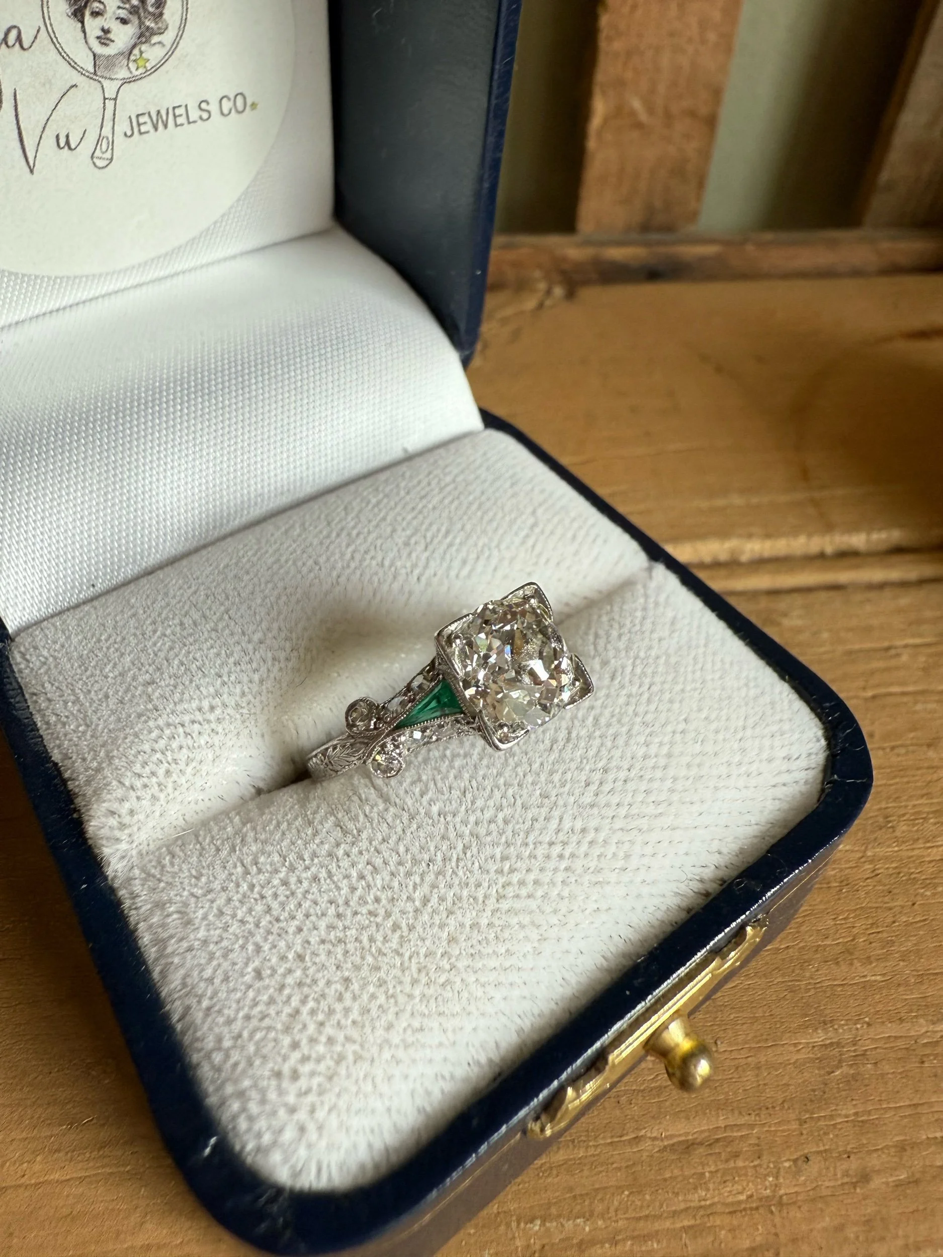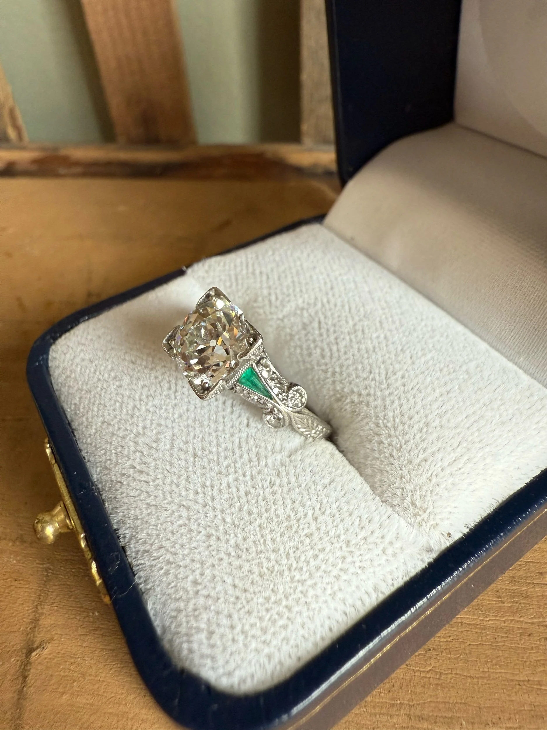 The diamond for an older cut is well done. It is set securely in a box mounting by corner prongs. Sits up off the finger 6.21 mm. On each side are triangle cut emeralds measuring approx. 3.97 mm x 1.96 mm, bezel set with milgrain edge. The gallery features filigree, scroll work, and 12 additional round cut diamonds measuring appro. 1.40 mm diameter each. Highly decorative ring with engraving and milgrain. The shoulders are darted with engraved flower motifon top and sides.