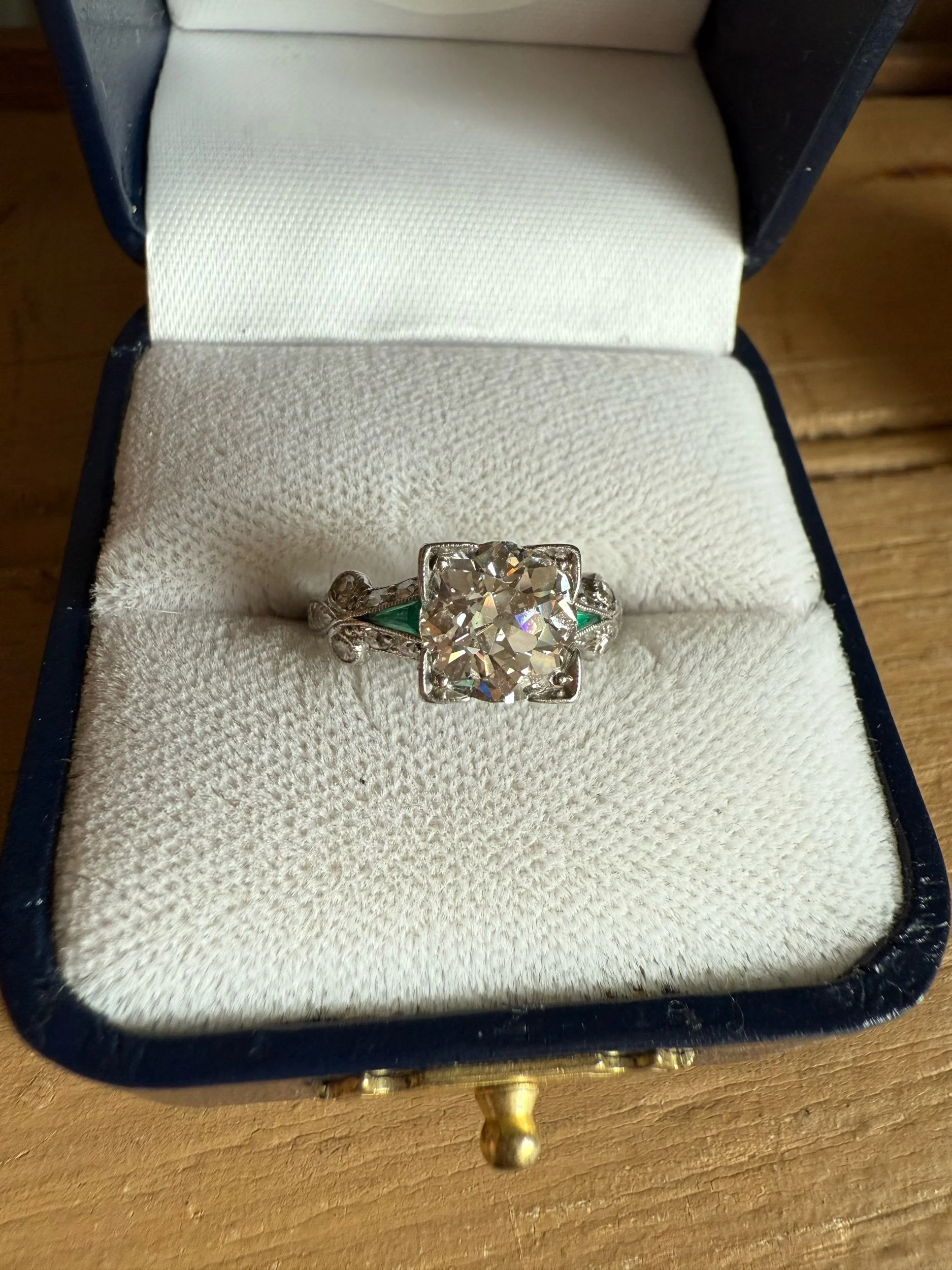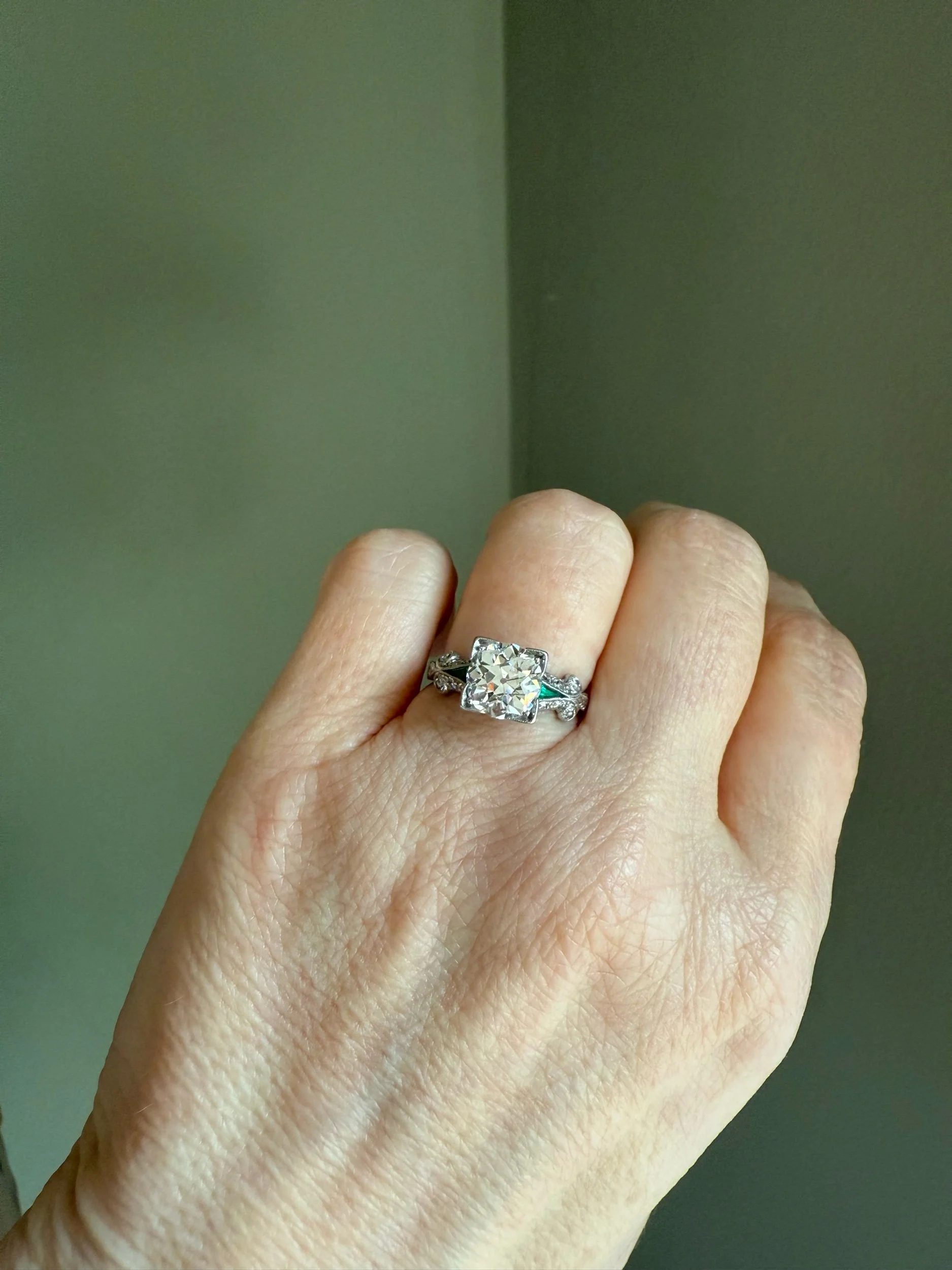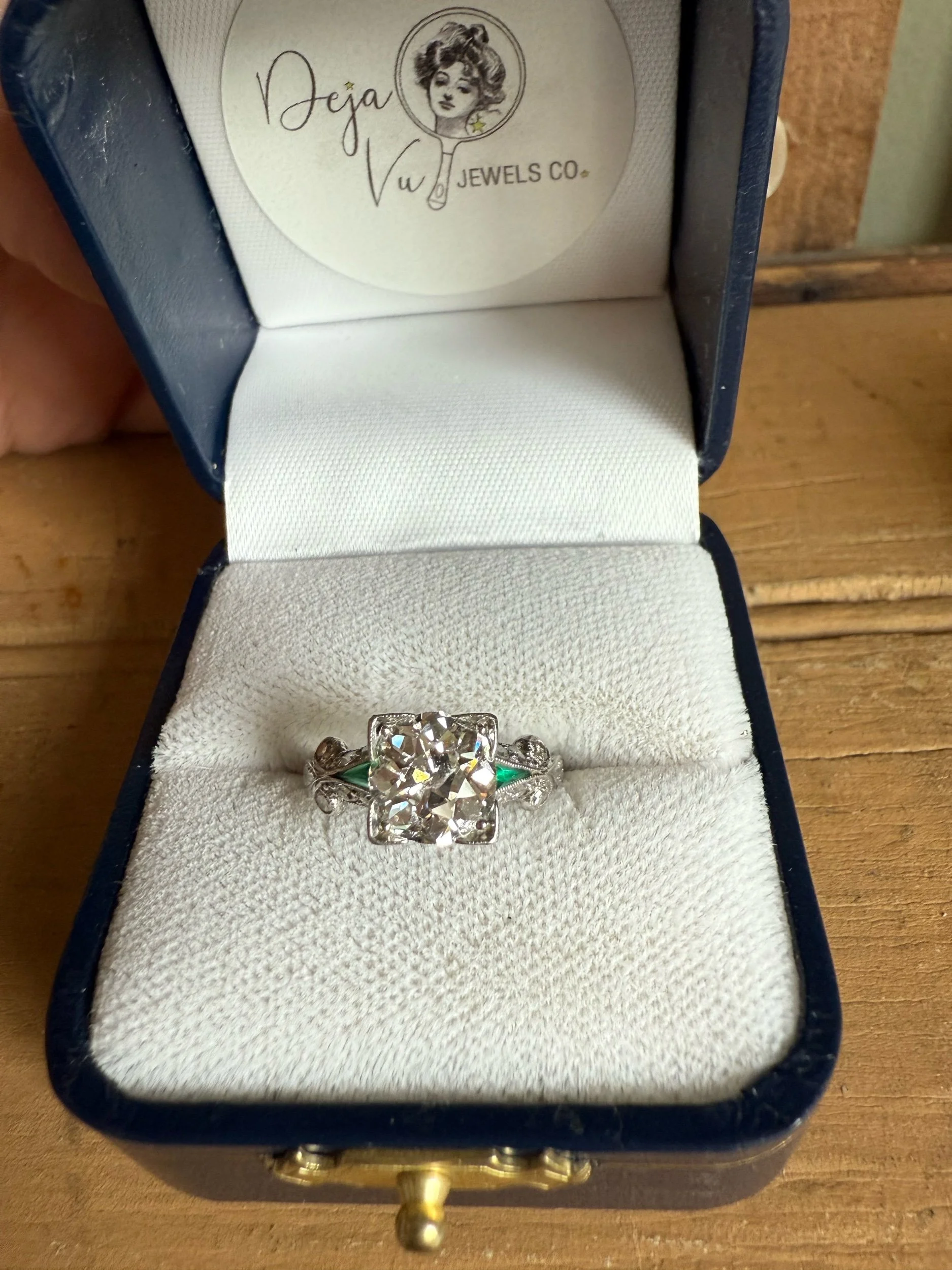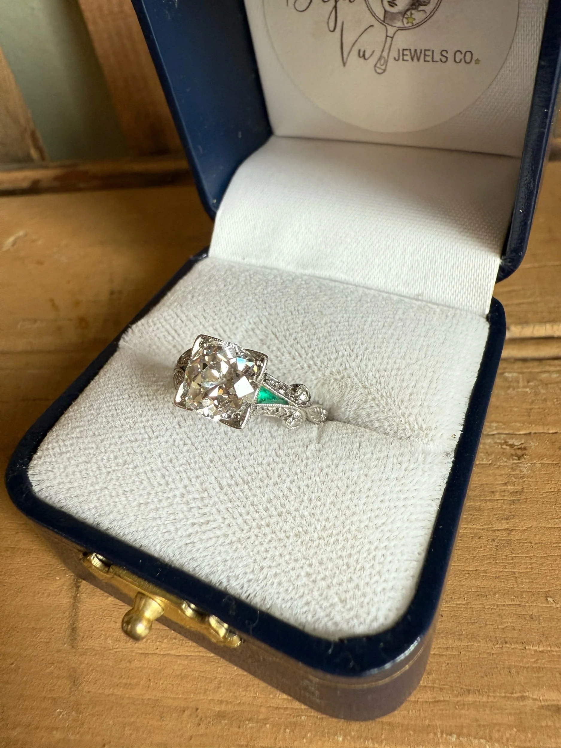 The diamond for an older cut is well done. It is set securely in a box mounting by corner prongs. Sits up off the finger 6.21 mm. On each side are triangle cut emeralds measuring approx. 3.97 mm x 1.96 mm, bezel set with milgrain edge. The gallery features filigree, scroll work, and 12 additional round cut diamonds measuring appro. 1.40 mm diameter each. Highly decorative ring with engraving and milgrain. The shoulders are darted with engraved flower motifon top and sides.