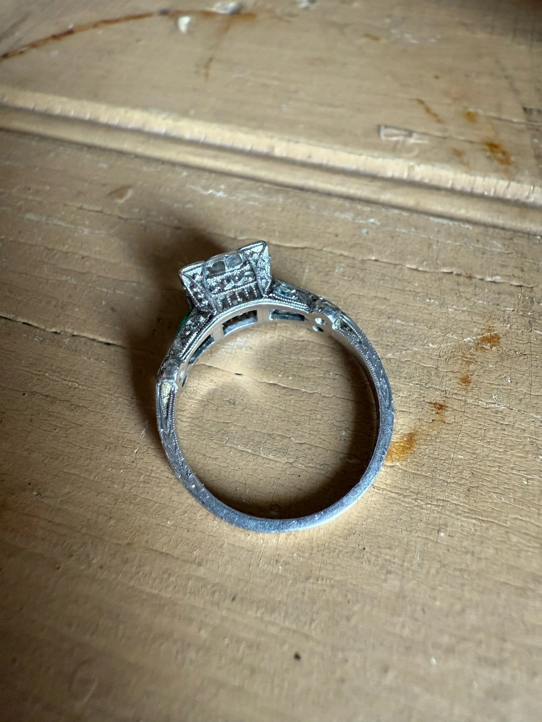 Overall the condition is very good. Very slight wear to the emeralds under magnification. The milgrain and design of the ring is still present. 4.3 grams