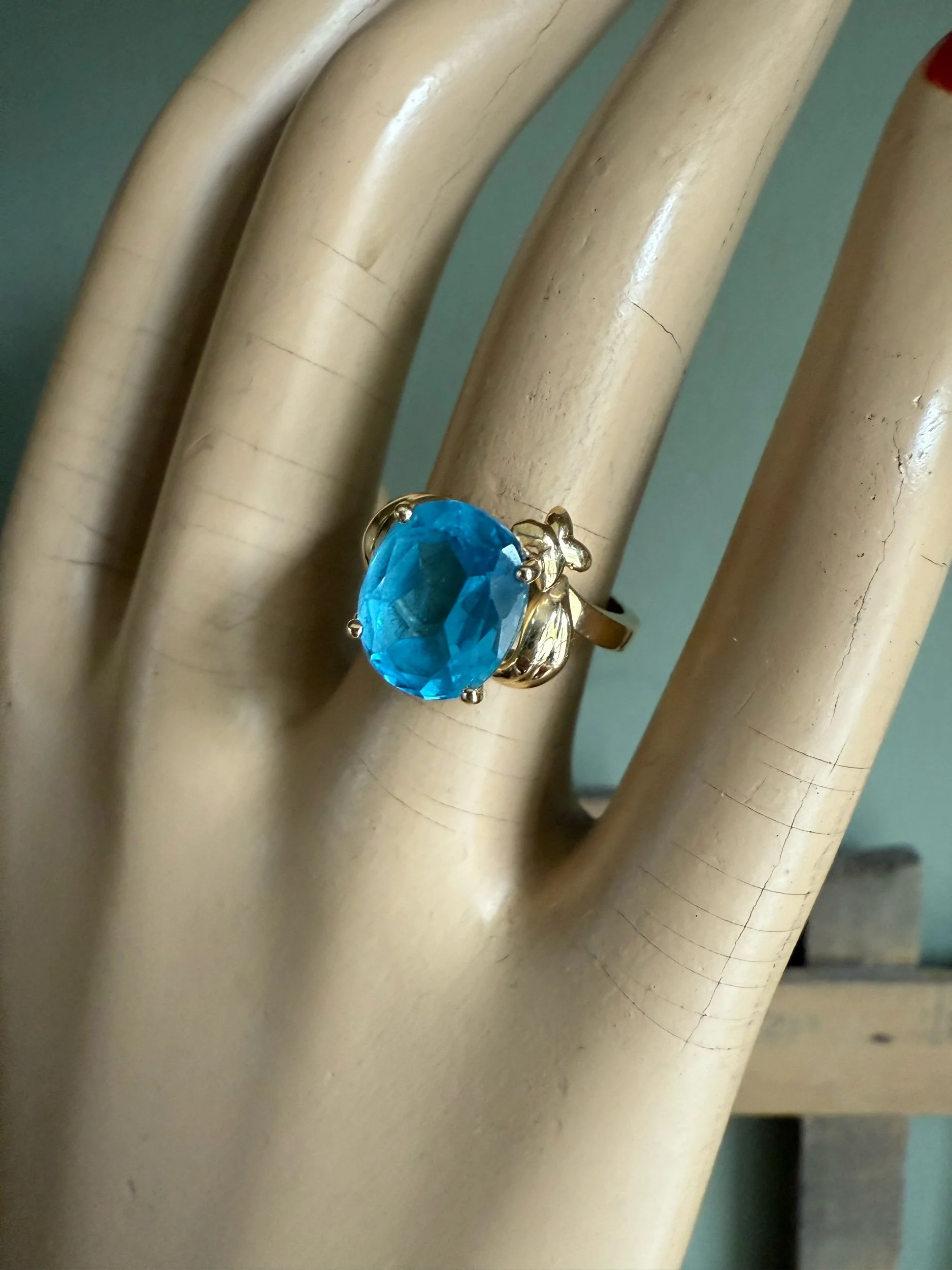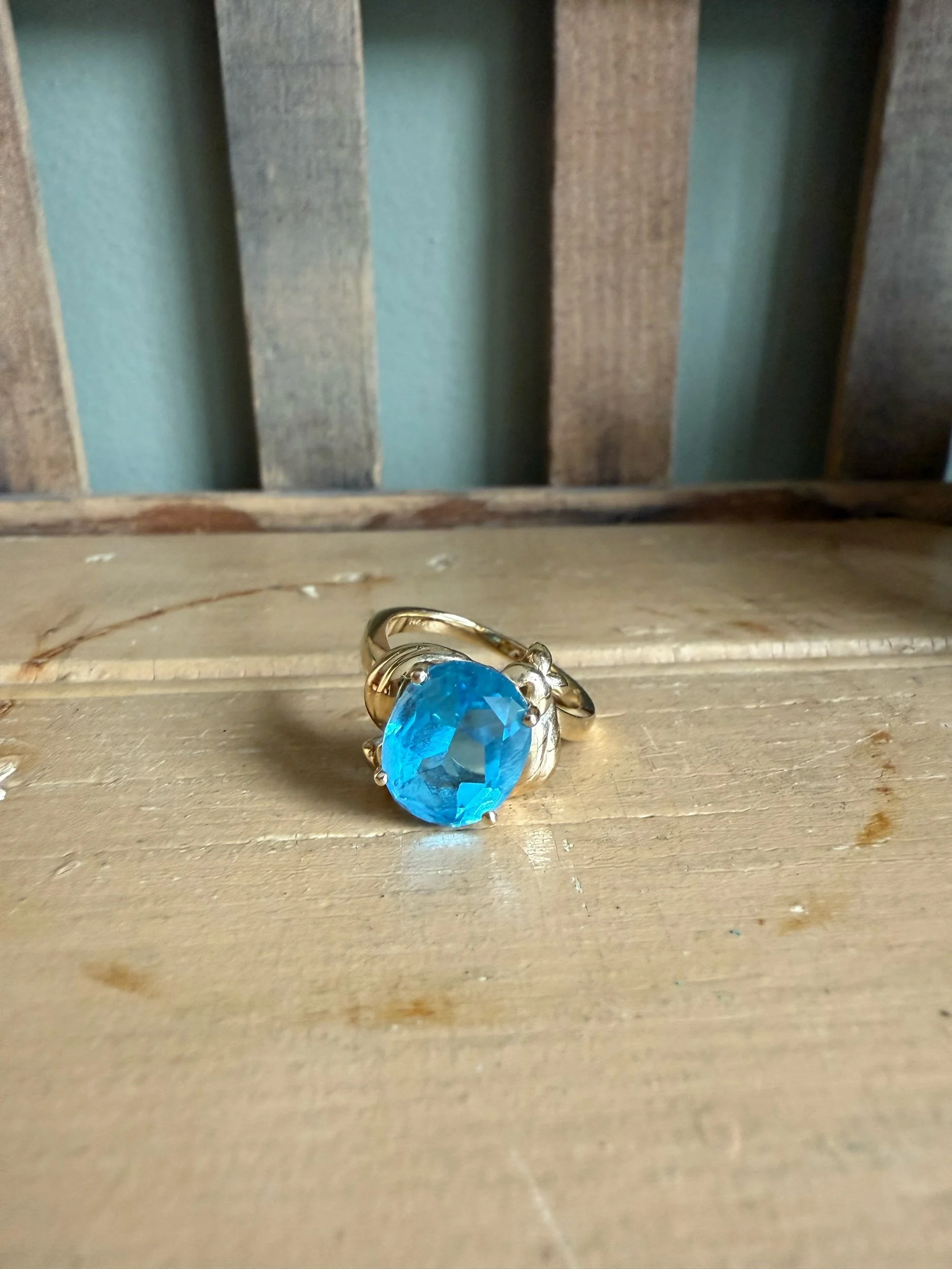 c1990-14K yellow gold (stamped in shank and tested) featuring an oval cut intense blue topaz, 11 x 9 mm, approx. 4 plus carats, securely set by four prongs. Very good preowned condition. Sits up off the finger 8.50 mm. It is a substantial piece, 4.8 grams. Currently a size 6 but message if you need sizing service. Layaway available.