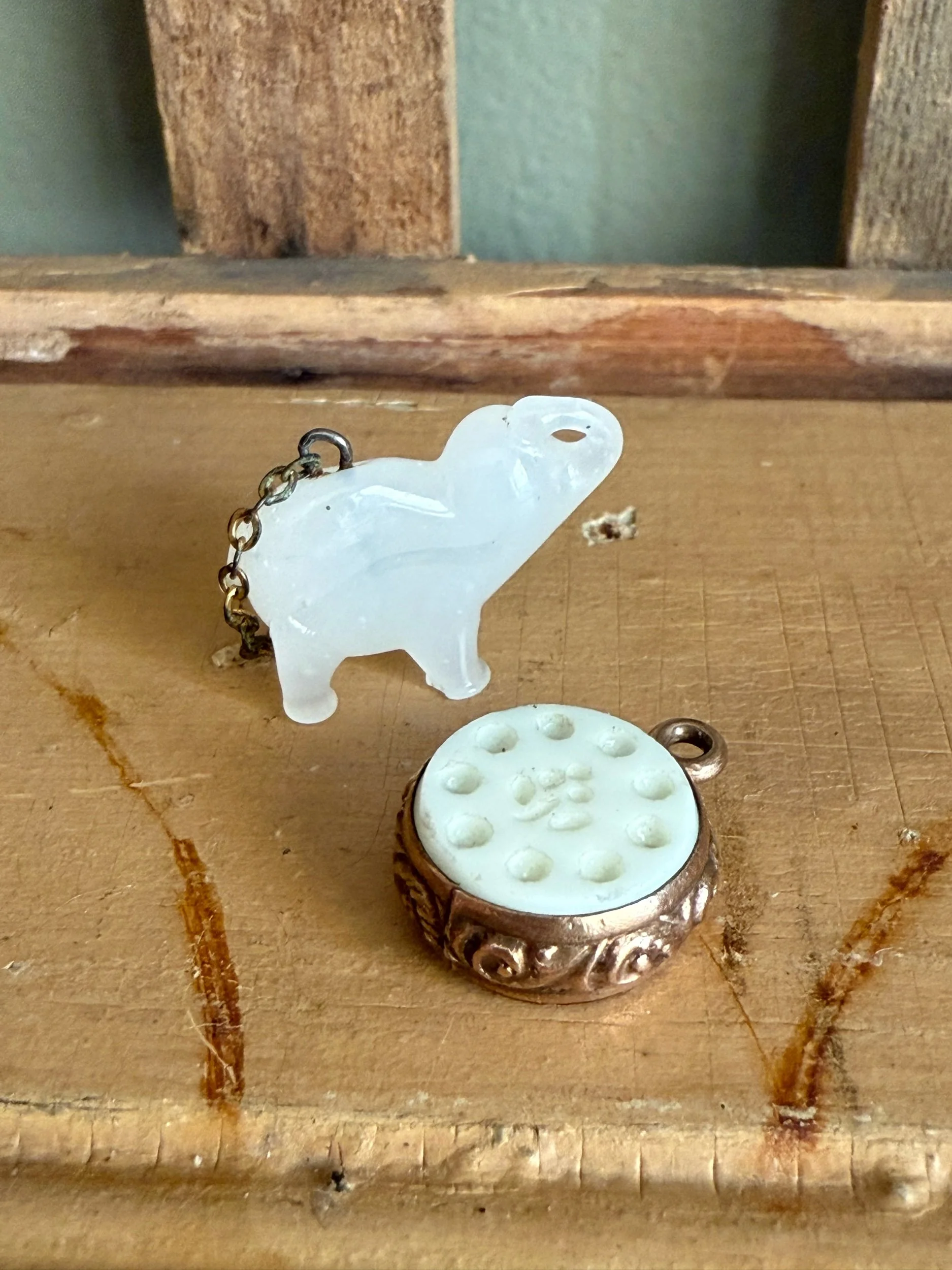From an estate with antique Victorian jewelry. The glass elephant is Czechoslovakian and measures 7/8" wide, in excellent antique condition.