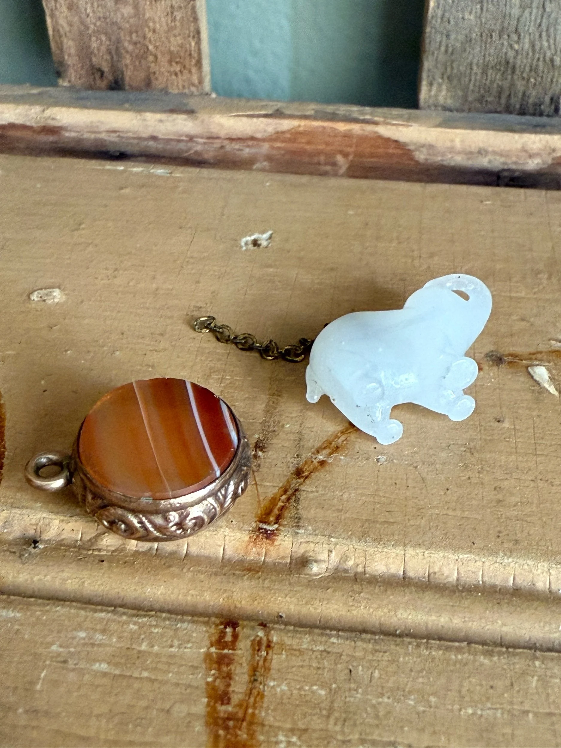 The antique charm has banded agate and glass with flower motif sides. 9/16" diameter. Slightly rose gold sides with scrollwork. Slightest wear to edge of agate but overall in very good condition.