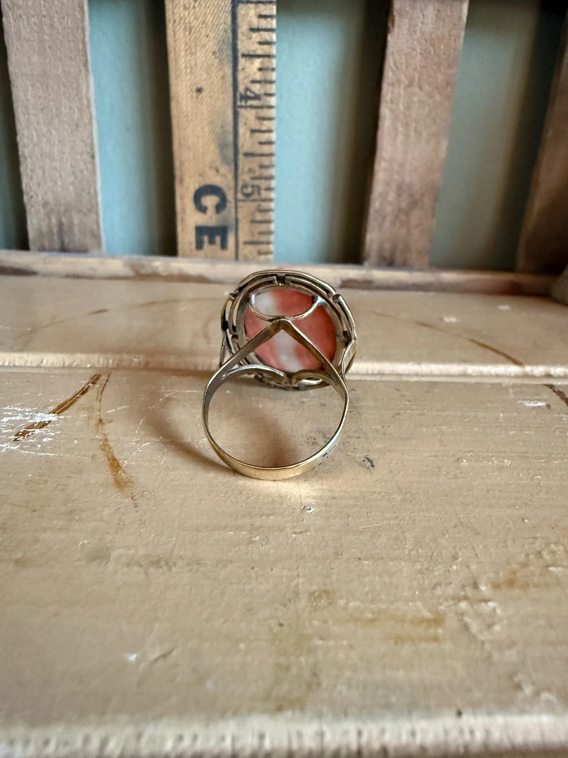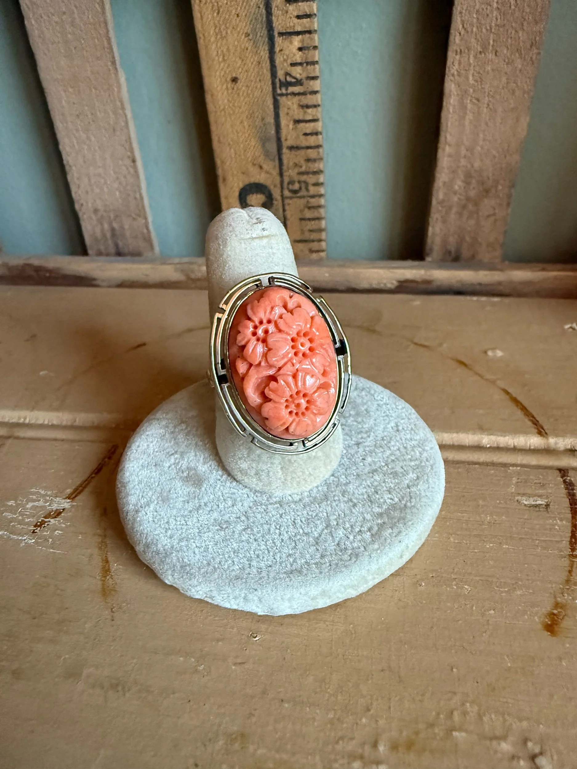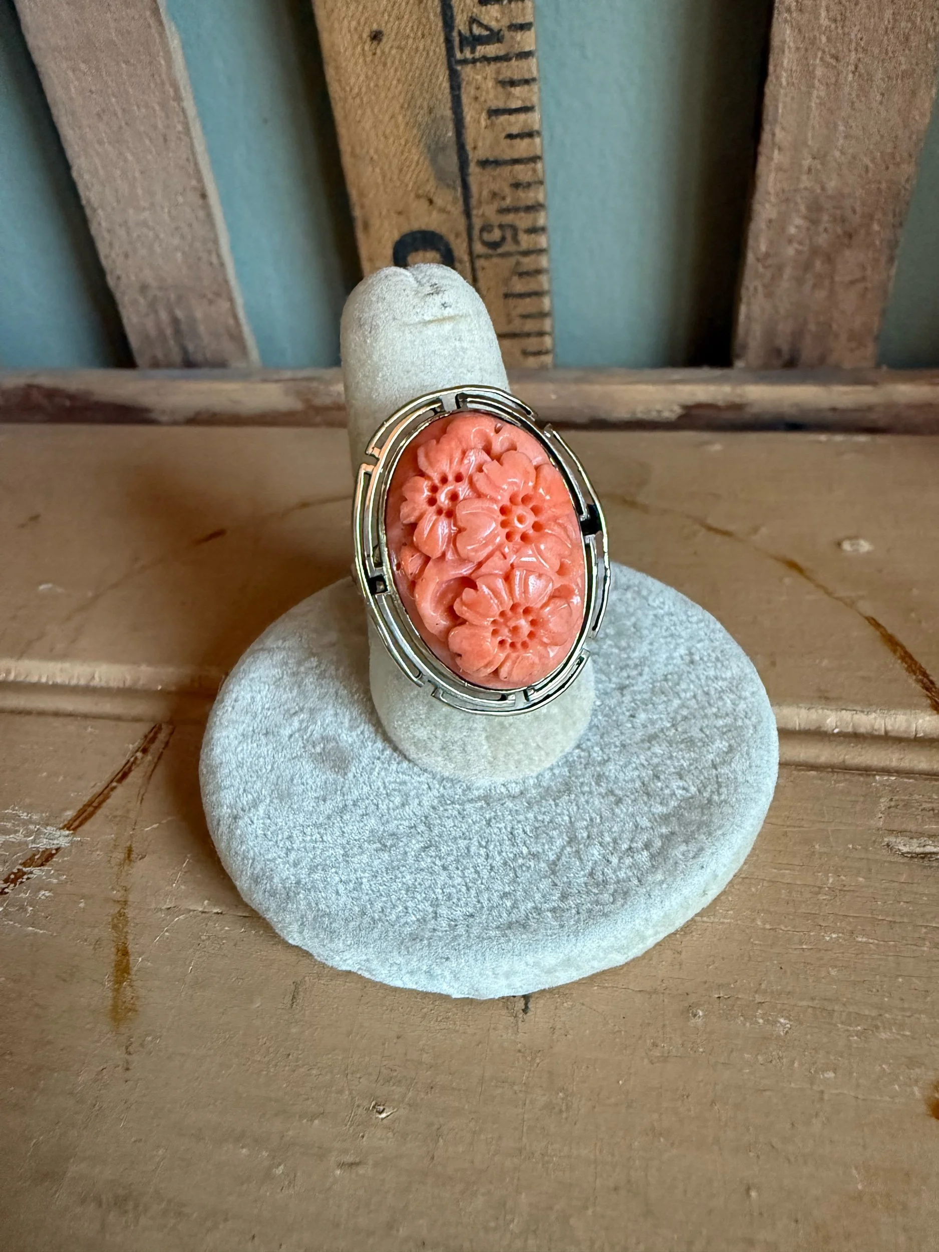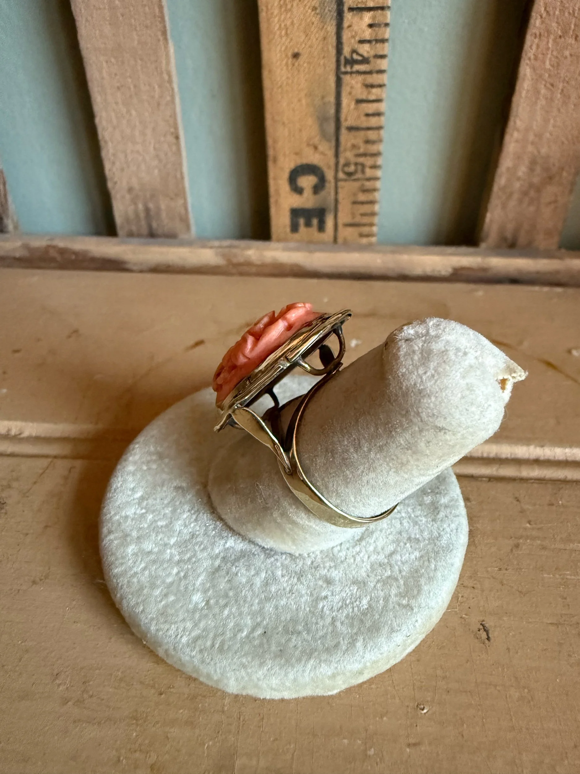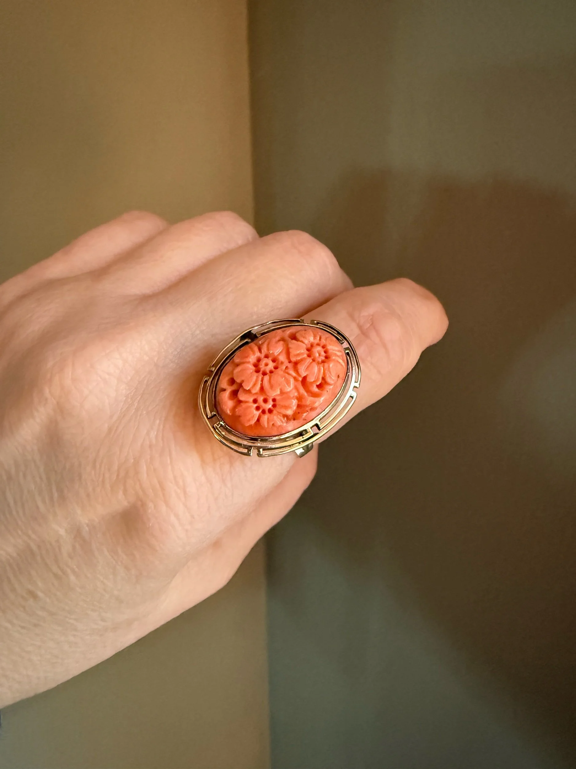 Love Love LOVE this ring. c1940's-It is stamped in the shank but just can't make it out. Have been tested as 10K yellow gold. Features an oval carved floral coral in a orangey slightly pinkish hue. My favorite part is a very cool designed frame around the coral. Makes a big statement on the finger--measures 1" x 3/4" looking down on the top of the ring. Sits up off the finger 3/8". Size 7.25 but message if you need sizing service. Overall this ring is in very good preowned condition. Unusual eye catching carved floral pattern that screams 1940's retro design--think Dorothy Draper! 5.7 grams