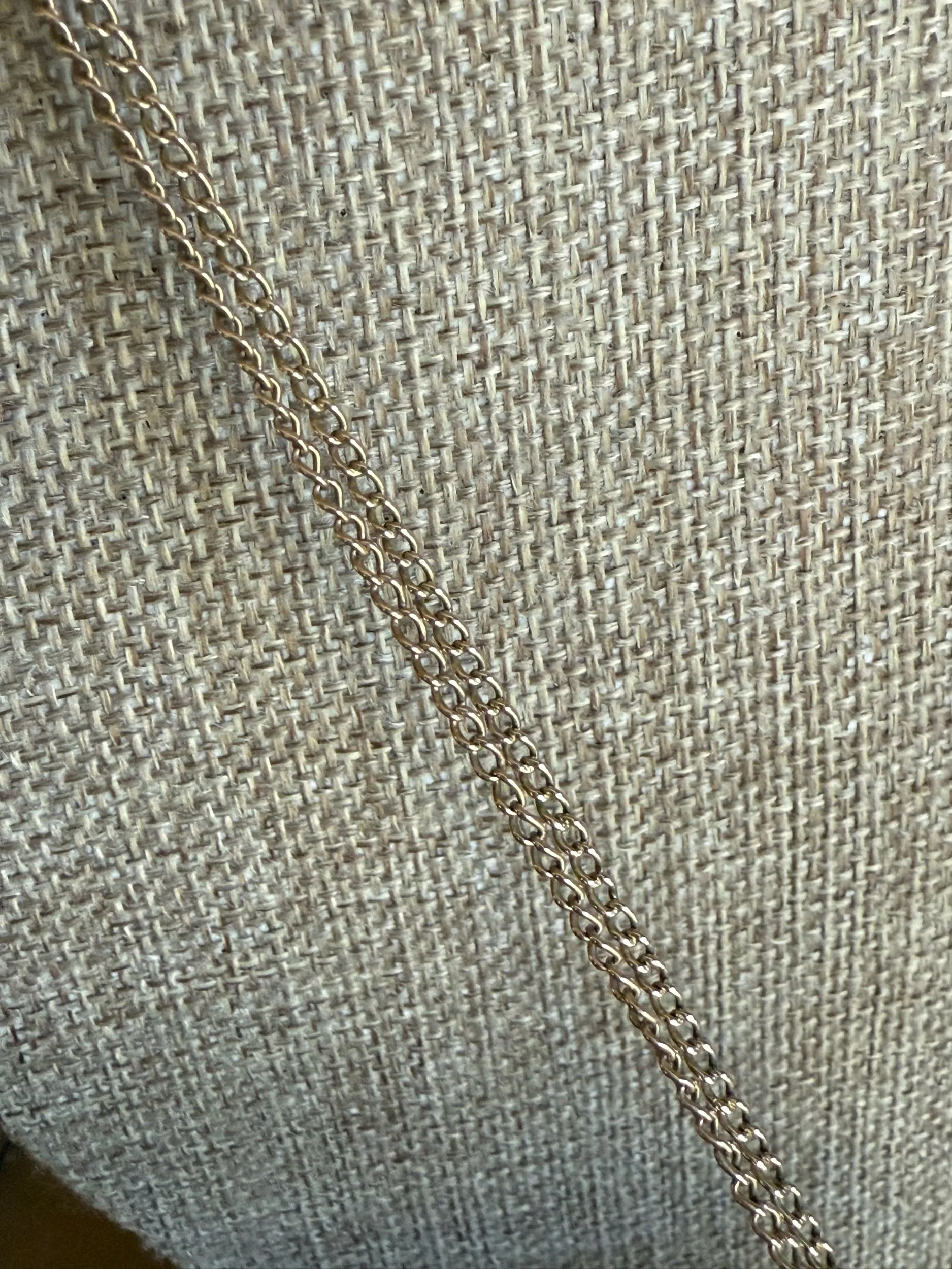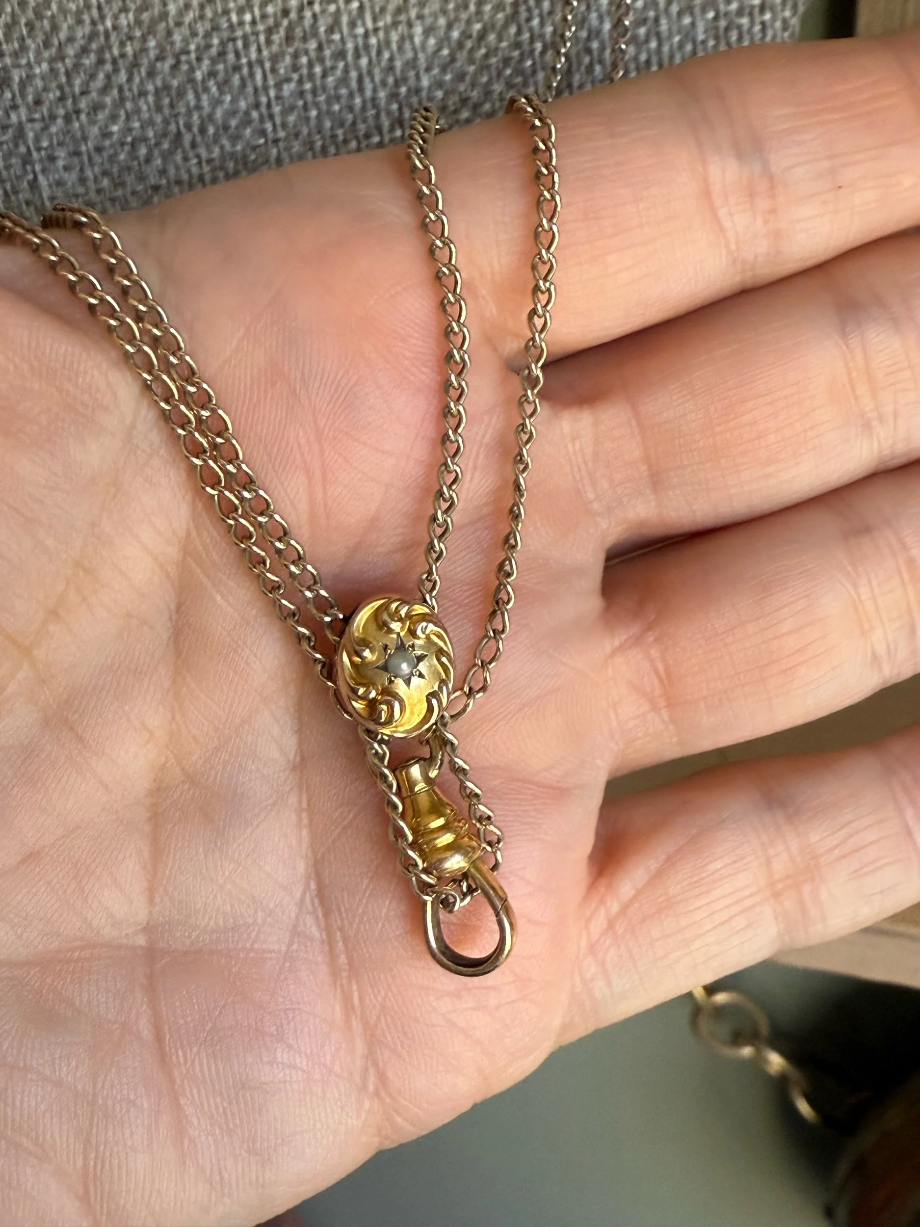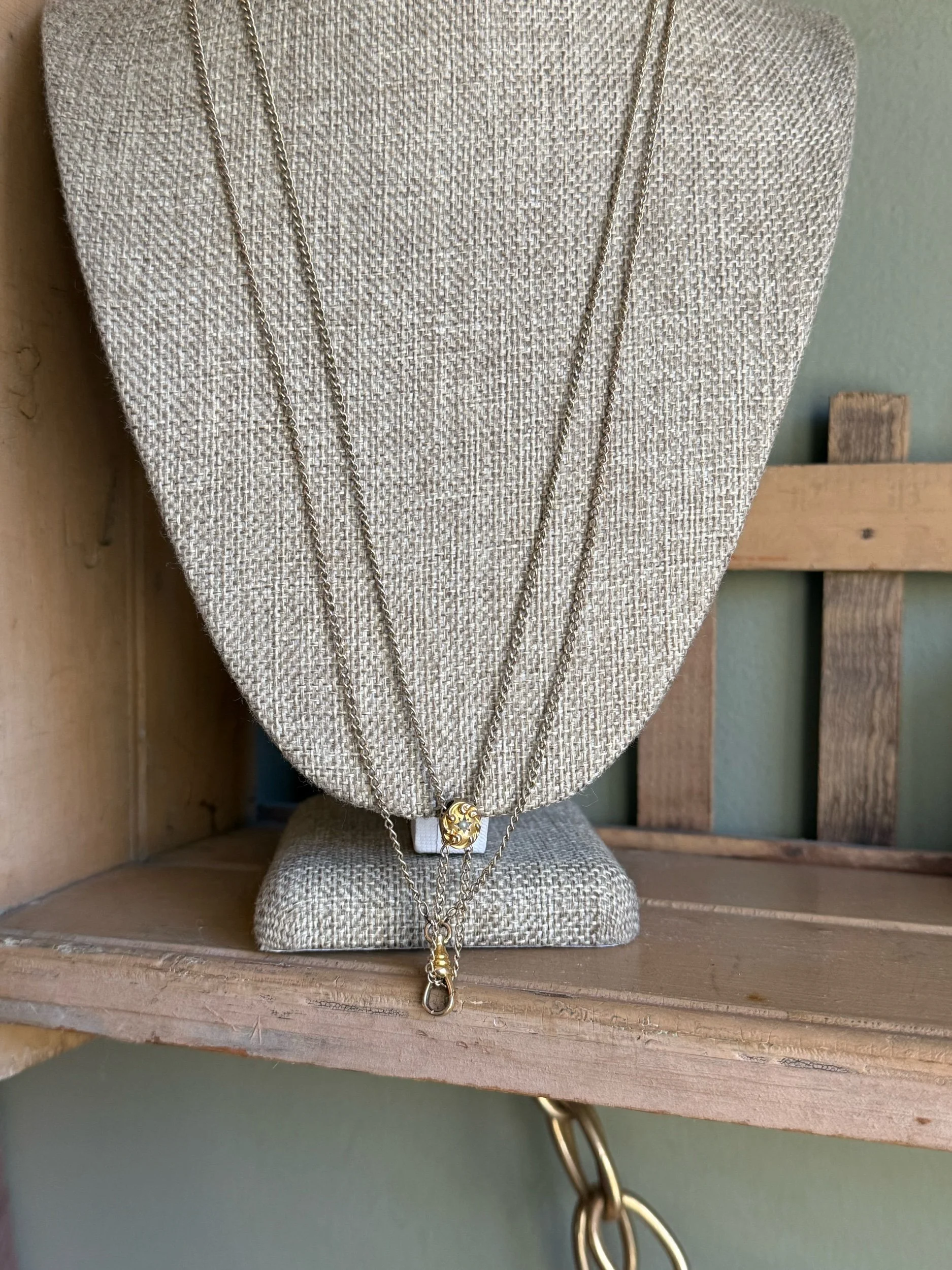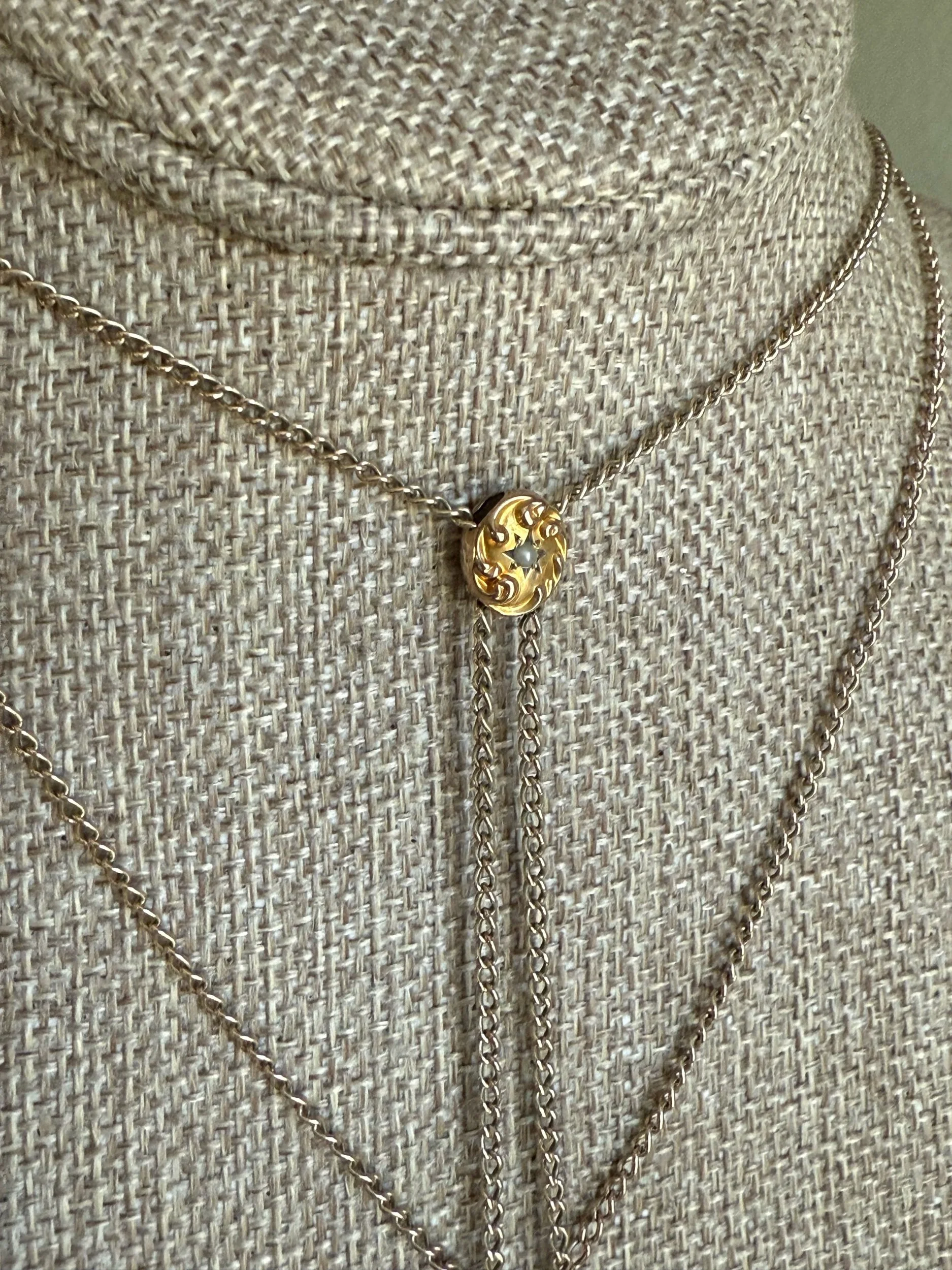 Gold filled long watch chain, 52" length, doubled 26" as shown in photograph. There is a pearl set oval slide that holds slightly on the chain. The dog clip is on good working order.