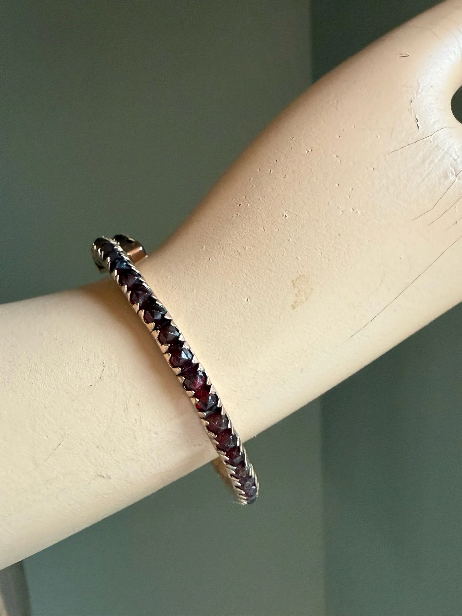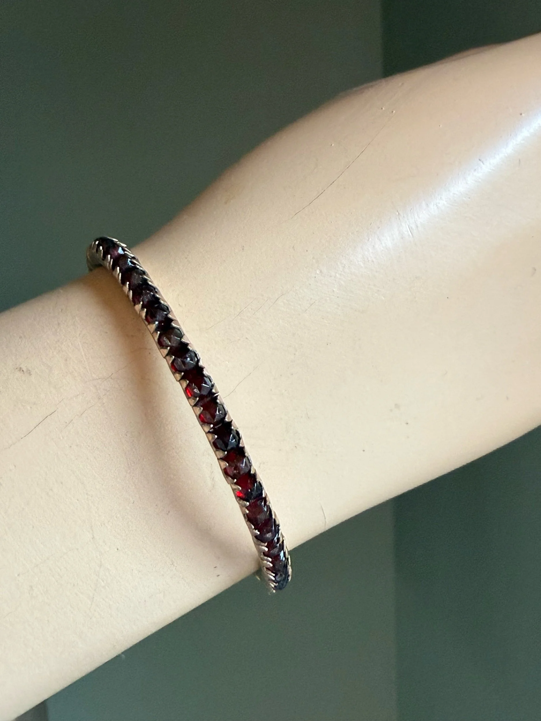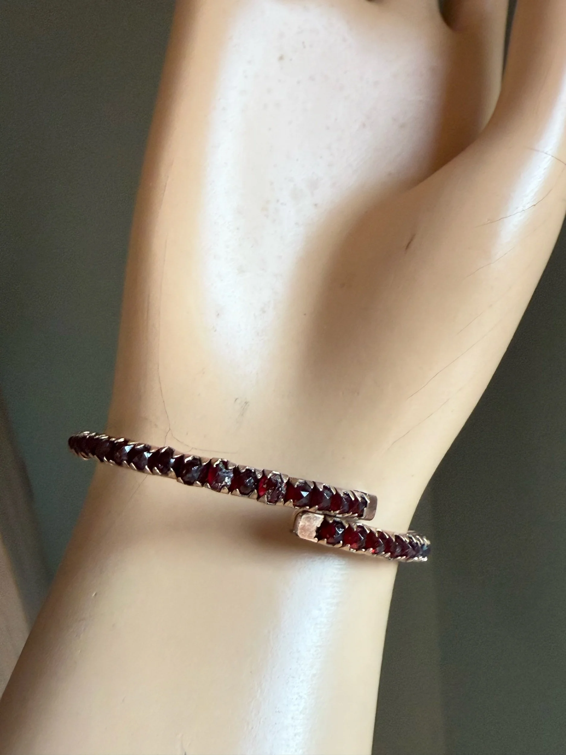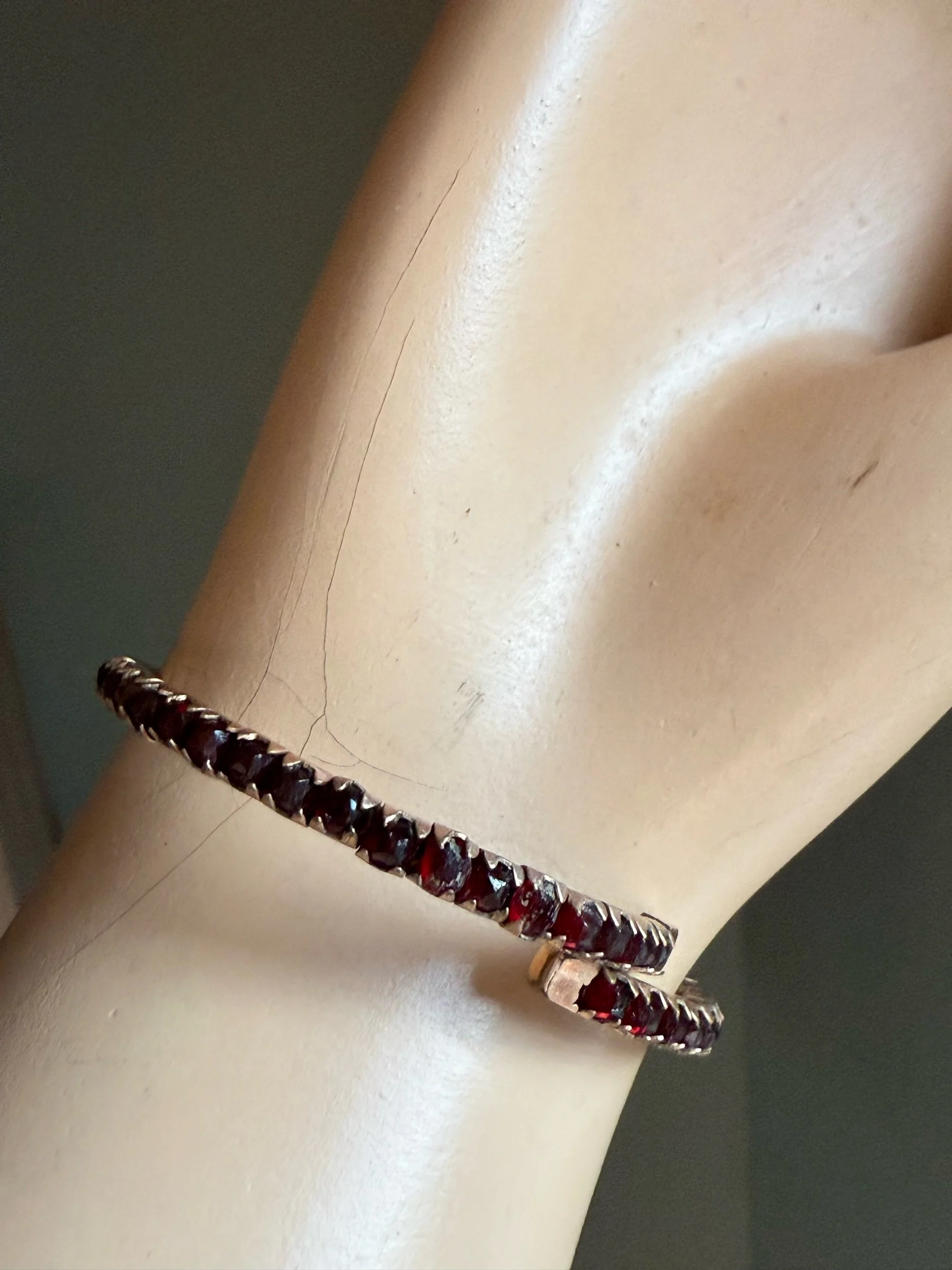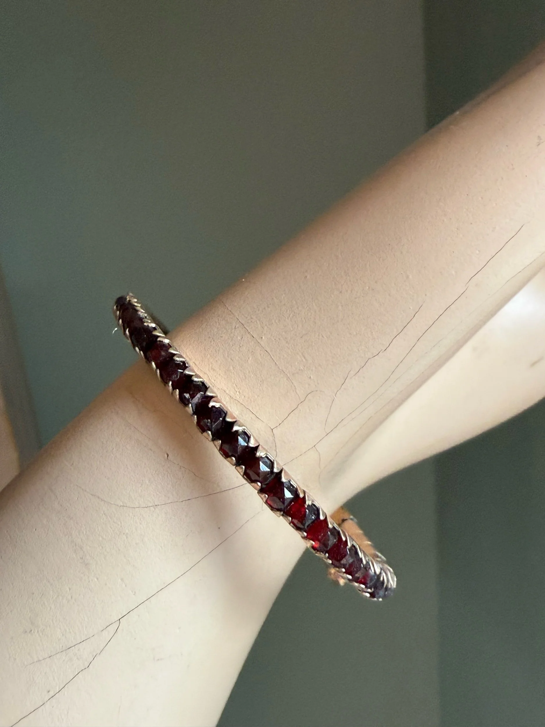 Rose gold filled stretch bracelet dating to the Edwardian era. The squarish rose cut like stones are glass garnets. 3/16" wide. The bracelet stretchs to accomodate different size wrist. My wrist in the photo is 6.25". Overall in very good antique condition-under magification tiny little nicks here and there (you have to search them out).