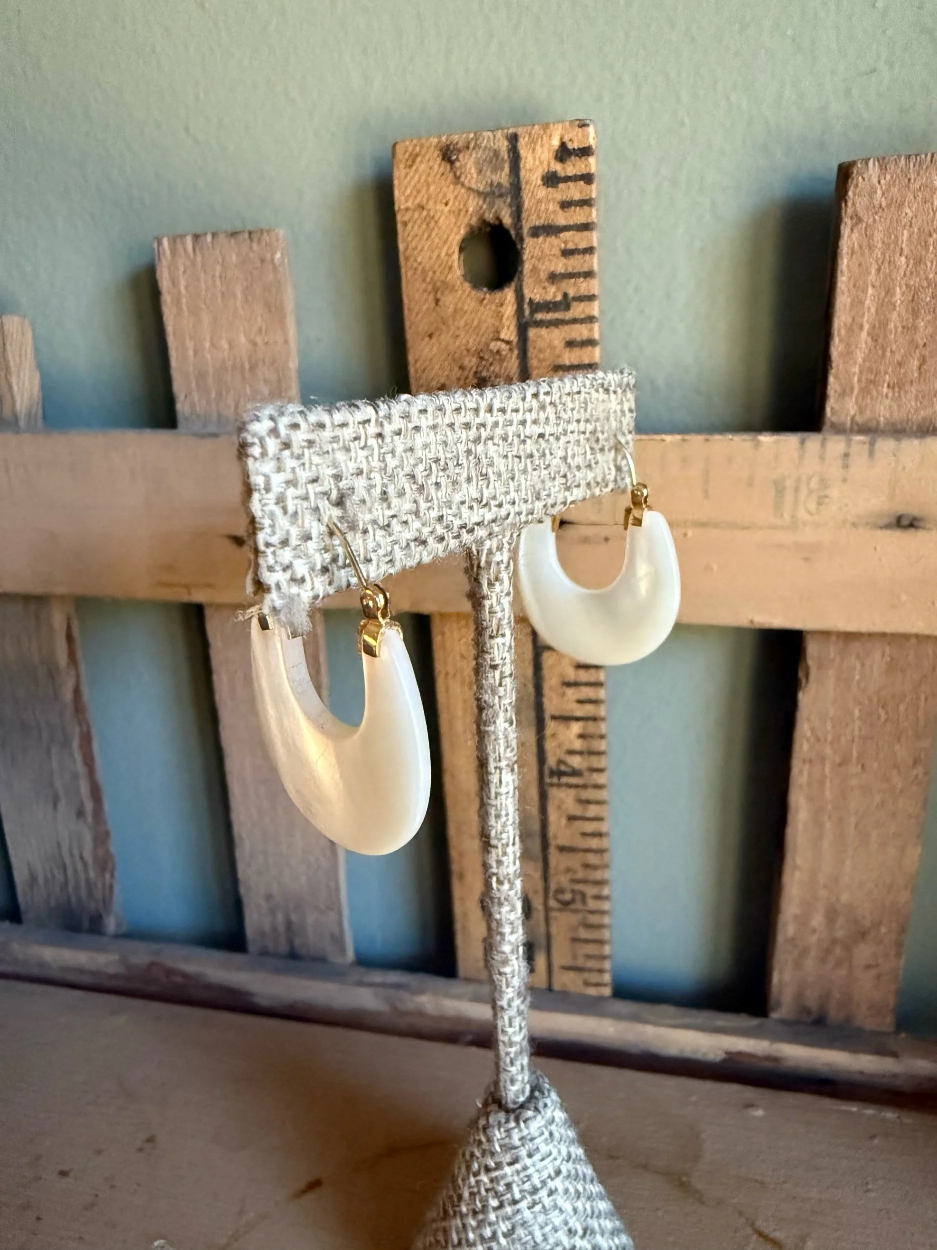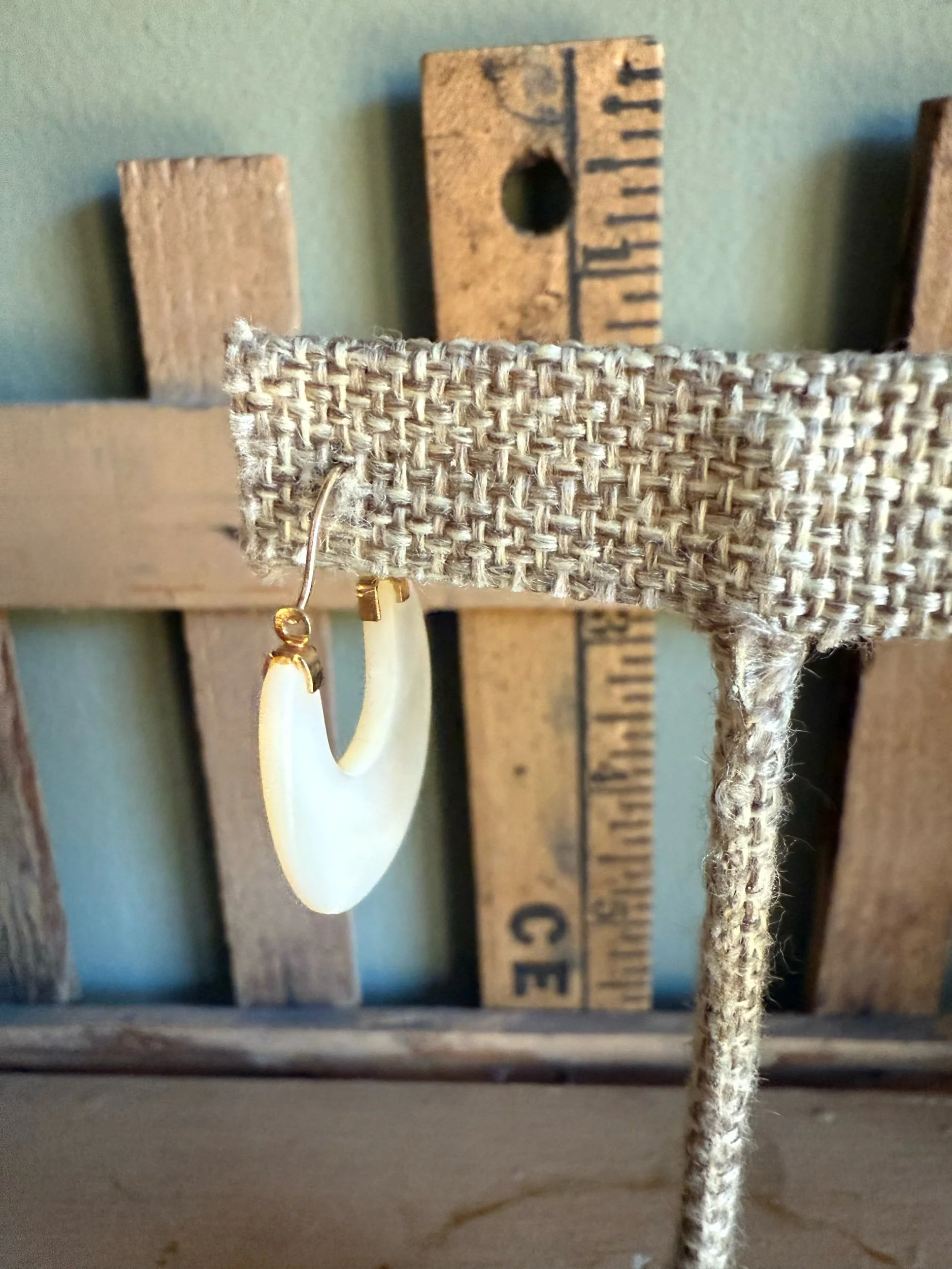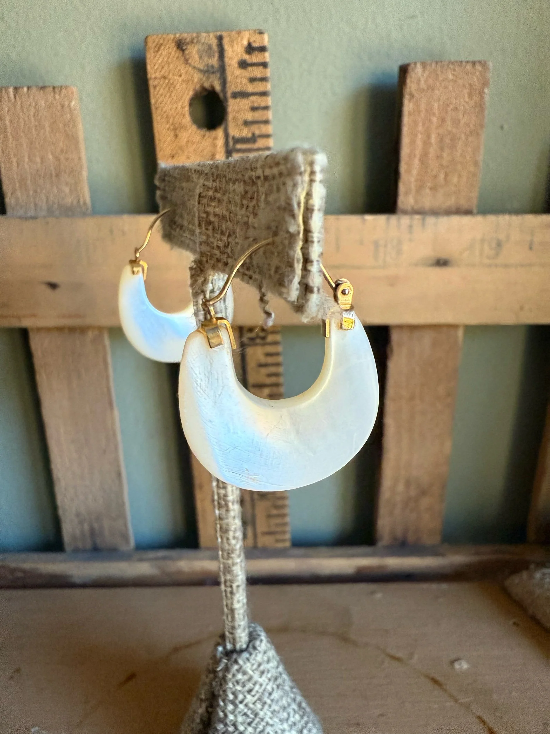 14k yellow gold (tested by acid and touchstone) earrings featuring carved mother of pearl in the shape of hoops. They close by putting the post into a circle. 1 1/8" top to bottom, 7/8" wide.