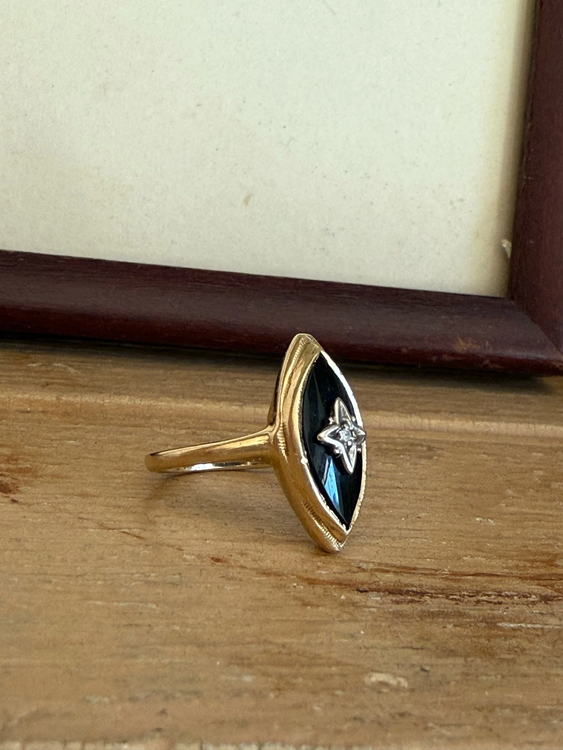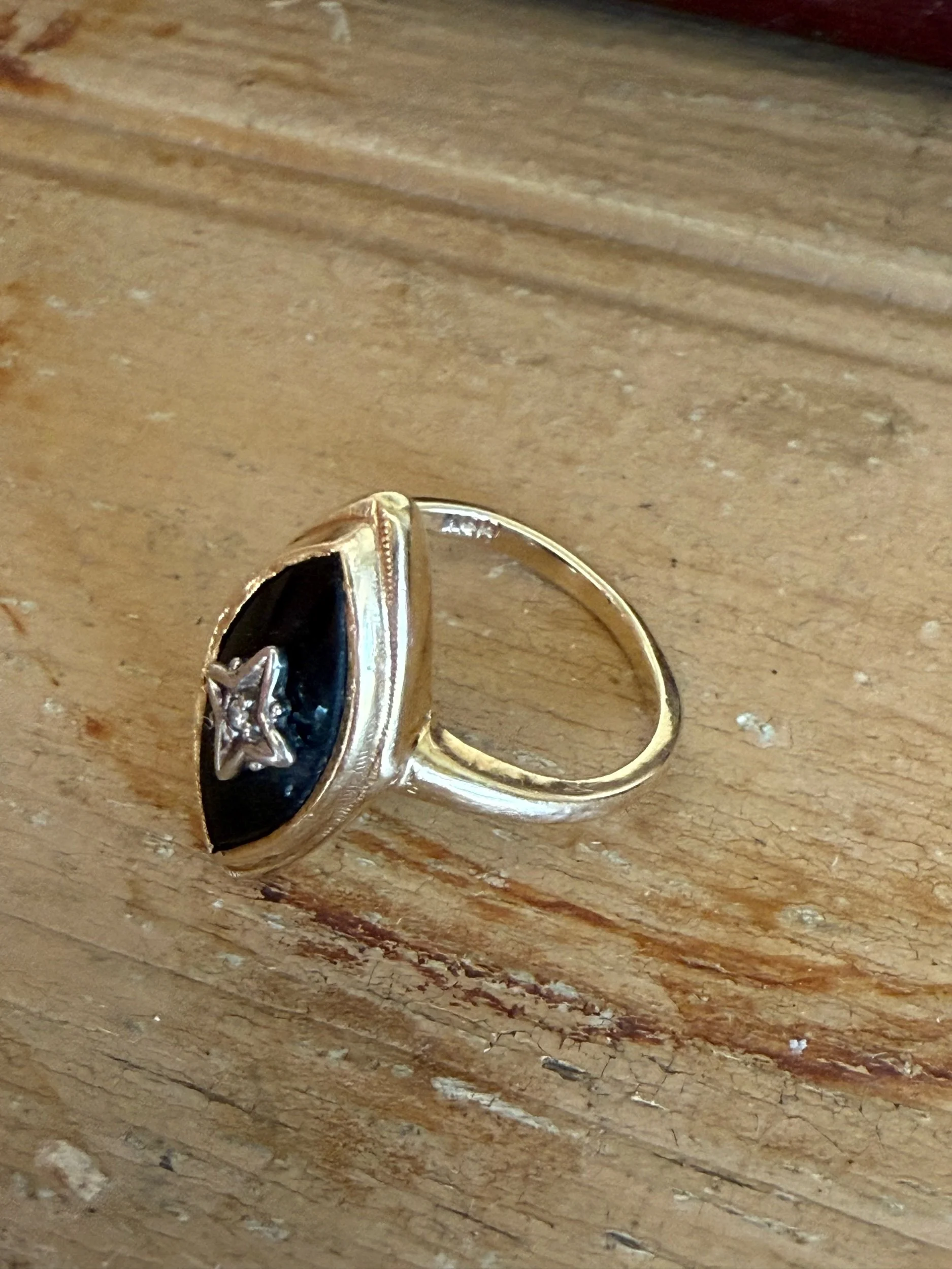 1940-1950 Vintage 14K yellow gold ring (stamped in shank and verified) featuring black onxy with a round cut diamond set in a 14K white gold star mounting. The diamond measures approx. 1.35 mm diameter. Front measures 3/4" x 5/8" wide.